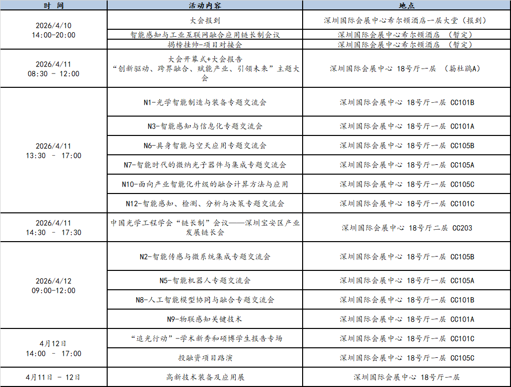 智能感知与工业互联网融合应用链长制会议、中国光学工程学会"链长制"会议——深圳宝安区产业发展链长会、"揭榜挂帅"技术对接会、投融资项目路演、"追光行动"-学术新秀和硕博学生报告专场、高新技术装备及应用展等。