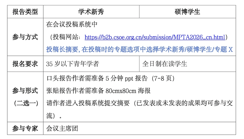 为进一步加强青年人才队伍建设,激发青年学者的科研热情,支持鼓励各层次青年学者的成长,本次大会由各专题共同组织,在会议期间举办青年学者&优秀学生报告专场,参与方式及相关信息参见下表,专场具体举办时间及安排将另行通知,欢迎广大青年学者积极投稿报名参与。