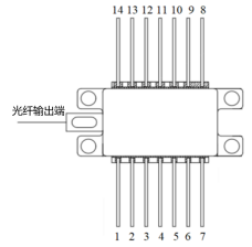 引出端排列见图2:面向管壳顶部,使光纤输出端指向左侧,从左下角按逆时针方向排列,引出端为1、2、3、4、5、6、7、8、9、10、11、12、13、14。