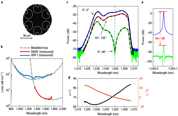 来自英国南安普顿大学光电研究中心的A. Taranta等人发现,经过特殊设计的反谐振空芯光纤可以将两个正交偏振模以10-10/m量级的耦合强度进行传输,实现一个类似于自由空间传输的波导结构。相关研究成果以题目“Exceptional polarization purity in antiresonant hollow-core optical fibres”于2020年5月11发表在Nature Photonics上。