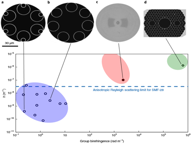 标准单模光纤(SSMF)在没有受到外界扰动时,其偏振纯度可以接近玻璃材料的各向瑞利散射特性所规定的极限值,例如SMF-28光纤在1550nm处其偏振耦合为3x10-8/m。然而当受外界环境扰动时,会受到强烈的偏振模耦合,从而影响器件的性能。通过引入大的双折射,保偏光纤可以破坏偏振模式耦合的相位条件,在外界的扰动下也能保持一个10-7至10-5/m的偏振耦合强度。然而,这些微弱的偏振耦合仍会给光纤系统带来各种有害的影响,如热相位噪声,瑞利散射等随机效应和光克尔效应、受激布里渊散射等非线性效应,限制了传感器的注入光功率和信噪比。