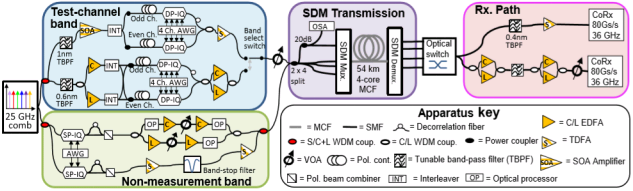 空分复用技术中,在标准通信单模直径(125μm)下来实现超大容量的传输一直也是该项技术的研究侧重点。来自日本国家信息和通信技术研究所的Benjamin J. Puttnam等人利用包层直径为125μm的4芯强耦合光纤,结合了空分复用技术(SDM)和波分复用技术(WDM),通过一个带宽扩展的光频梳光源在S与C+L波段实现了24.5GBaud的偏振复用16-QAM和偏振复用256-QAM的传输,聚合吞吐量达到了596.Tb/s。单个空间信道吞吐量达到了149.1Tb/s,距离现有单模光纤传输纪录不到1%。相关研究成果以题目“0.596 Pb/s S, C, L-Band Transmission in a 125µm Diameter 4-core Fiber Using a Single Wideband Comb Source”于2020年3月发表在美国光纤通信会议(Optical Fiber Communication 2020)上,被评为所在专题的Top-Scored。