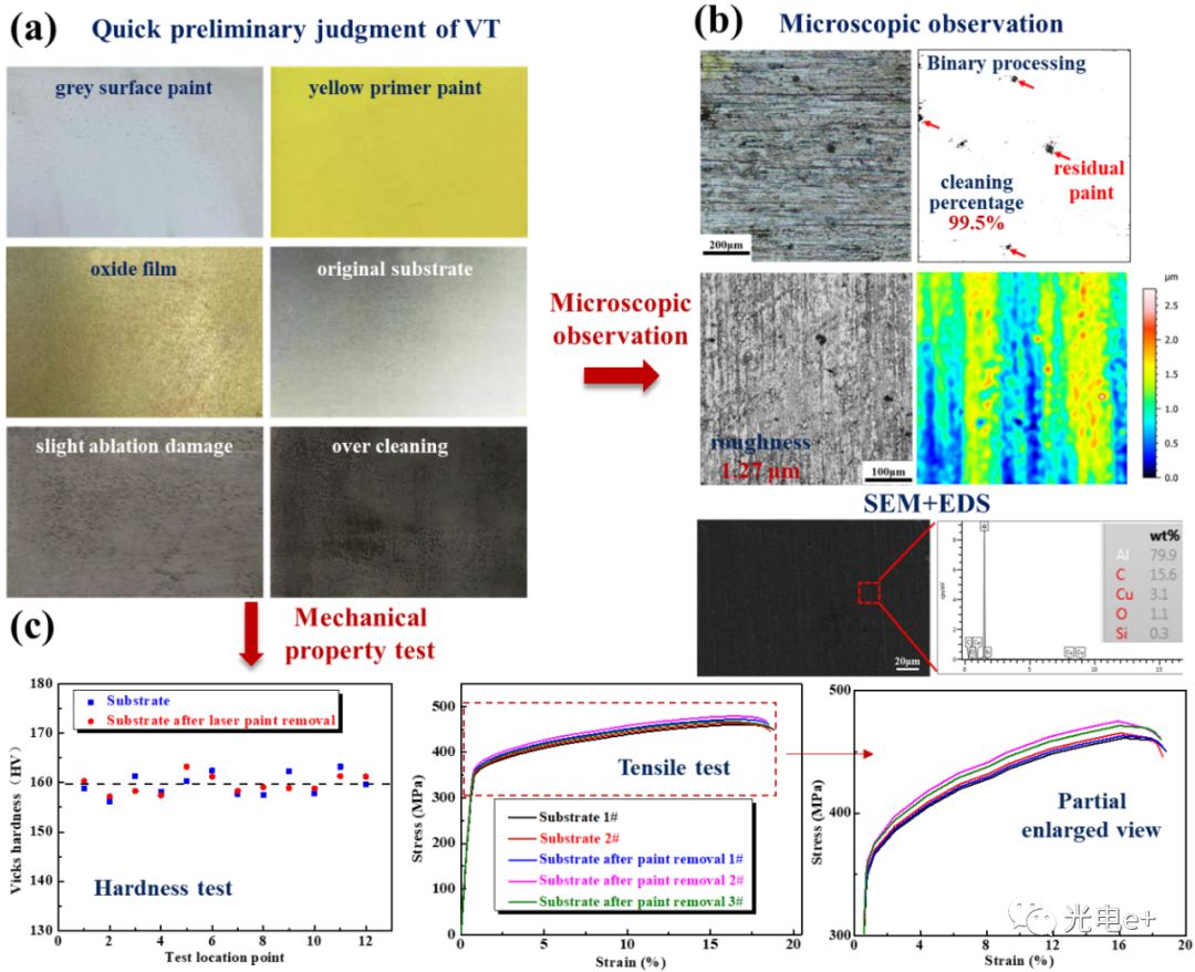 图3 某型飞机蒙皮激光除漆的效果评价:(a) 目视检测初判;(b) 微观组织测试;(c) 力学性能测试