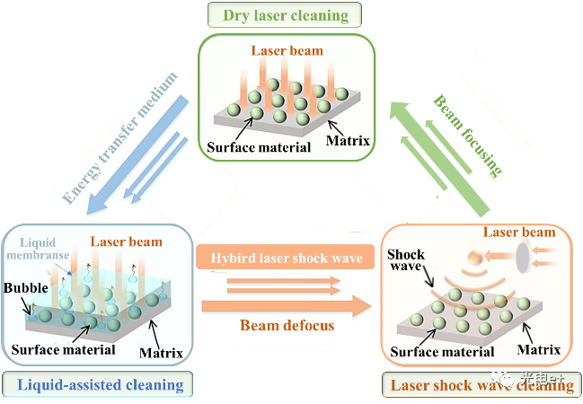 飞机长期在潮湿、高压以及冷热循环的复杂环境中服役,不可避免地导致蒙皮表面漆层出现褪色、老化、腐蚀以及龟裂等缺陷,从而危及飞机的飞行安全。因此,必须定期对蒙皮原有漆层进行清除后再重新涂装。据报道,一架波音747飞机漆层的清洗周期为3~5年,单次清除面积近2000 m2 ,总质量约为250~300 kg。某型军用飞机在飞行数小时后就需要对漆层进行清除和重新涂装。可见,蒙皮除漆是飞机维护领域一项重要的基础工作。目前,飞机蒙皮除漆方法主要包括手工机械打磨、高压水力冲击、二氧化碳喷射清洗、化学试剂清洗(如甲基乙基酮和甲基氯等)、塑料介质喷射和超声波除漆等[8]。与其他方法相比,激光除漆技术(Laser paint stripping,LPS)具有无环境污染、与蒙皮无机械接触、除漆精确度高以及可实时监测等优势,已成功应用于国外军用和民用飞机的整机除漆。本文综述了LPS技术在飞机蒙皮除漆工程化应用的研究现状和发展趋势,对激光除漆方法和机理、工程化除漆工艺设计以及激光除漆技术标准等进行了讨论。激光除漆方法主要包括干式、湿式和激光冲击波这三种典型的脉冲激光清洗方式。