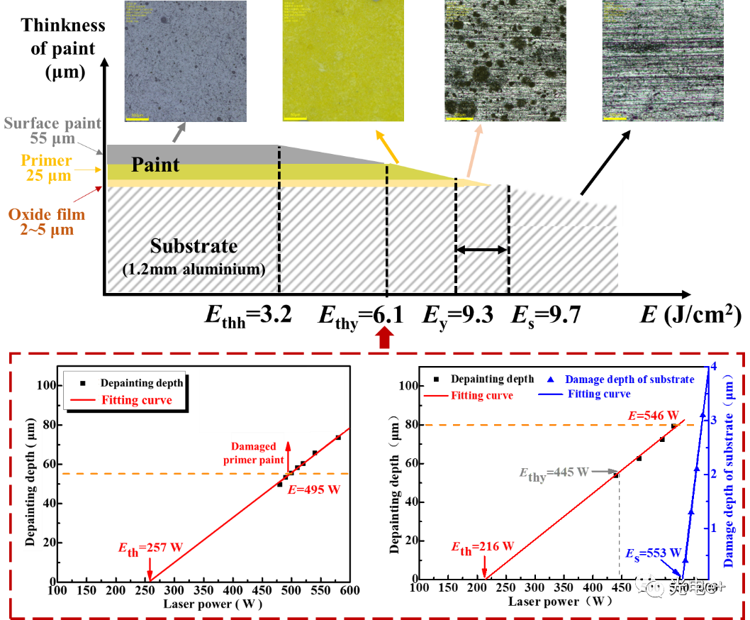 图2 某型飞机蒙皮激光除漆的激光能量密度控制范围示意图在飞机蒙皮激光除漆过程中,如果漆层与基体存在明显的颜色差异可通过目视检测方法观察除漆后基体表面的宏观形貌来初步判断除漆效果。通过显微镜观察清洗后表面并借助Image J图像处理软件对显微照片进行二值化处理,可快速的计算出基材表面的清洁率和表面粗糙度;借助扫描电镜观测除漆后表面和随机选取区域进行EDS测试,能进一步确定氧化膜和基体是否损伤。为进一步确定激光除漆是否会影响飞机蒙皮基体的力学性能,可对激光除漆前、后蒙皮基材的力学性能进行对比。