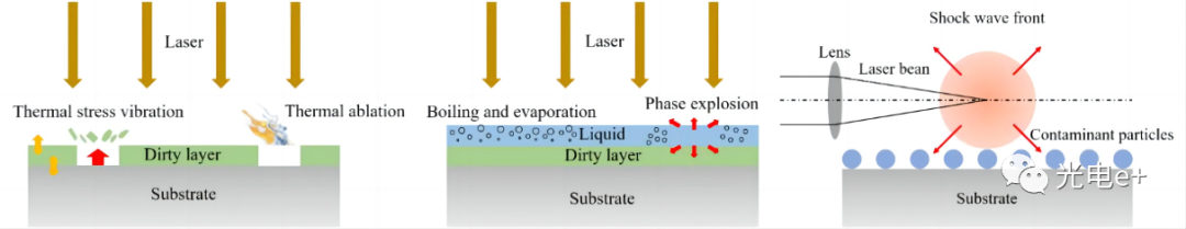 本文首先介绍了三种典型的激光清洗方法及其机理,其中干式激光清洗目前的使用最为广泛,该方法利用高能量激光直接辐照在基体表面,使污染物或基体产生瞬时热膨胀后克服二者间的结合力,或是使污染物直接汽化挥发,以达到清洗的效果。湿式激光清洗通过液膜起辅助作用,用于去除一些较难清除的附着物。等离子冲击波清洗通过激光束的汇聚,将焦点处的空气电离,电离产生的冲击波扩张延伸与微粒接触,使微粒受到冲击后滚动去除。