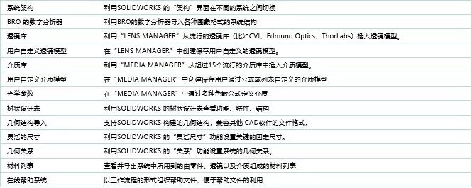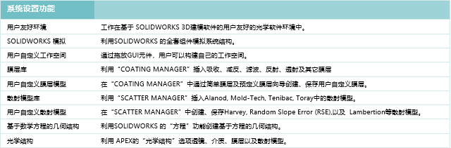 portant; overflow-wrap: break-word !important;">APEX主要特点portant; overflow-wrap: break-word !important;">易学易用:光学和 CAD 软件高度兼容,非常直观,易学易用。portant; overflow-wrap: break-word !important;">集成 SOLIDWORKS:SOLIDWORKS 环境下完全的光学设计和分析能力。portant; overflow-wrap: break-word !important;">CAD/光学环境:工作于统一环境下,避免了两类软件之间的翻译、转换。portant; overflow-wrap: break-word !important;">简单的工作流程:以简单易学的工作流程创建可视化的光学、照明系统。portant; overflow-wrap: break-word !important;">瞬时反馈:瞬时反馈系统特性或分析步骤中需要输入的参量。portant; overflow-wrap: break-word !important;">在线帮助体系:以工作流程的形式组织帮助文件,便于帮助文件的利用。portant; overflow-wrap: break-word !important;">数据库资源:提供包含光源、透镜、介质、膜层、散射模型等数据库以及用户定制数据库。 portant; overflow-wrap: break-word !important;">快速光线追迹:利用基于 ASAP 核心的引擎进行快速、准确的光线追迹。 portant; overflow-wrap: break-word !important;">灵活的分析能力:提供多种分析工具,便于我们理解光学系统的特性。 portant; overflow-wrap: break-word !important;">自动保存结果:在一个项目下同时进行多个系统的模拟,自动保存模拟、分析结果。 portant; overflow-wrap: break-word !important;">回访模拟结果:可以在多个自动保存的模拟结果之间进行切换。 portant; overflow-wrap: break-word !important;">项目共享:共享系统的所有特性、所有模拟、分析结果。
